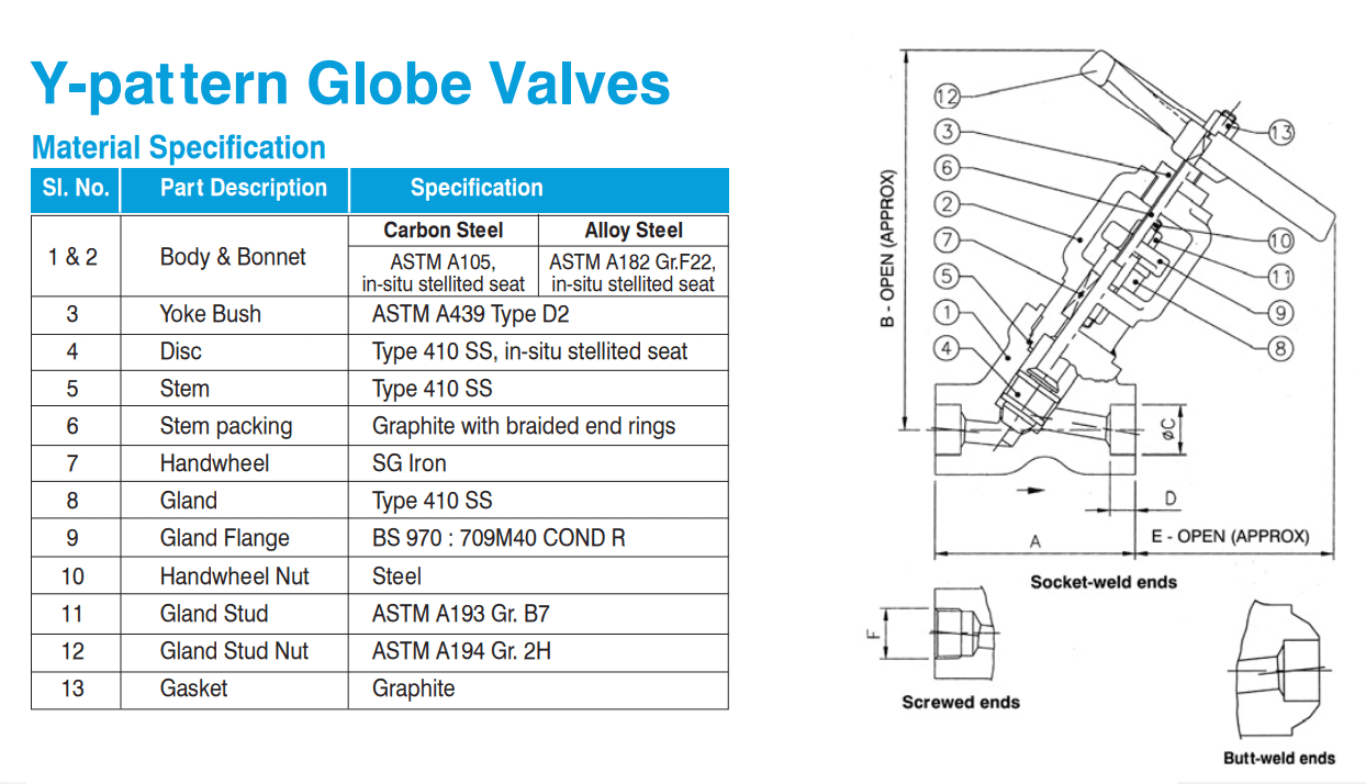 • Y-pattern design in Globe and Check valves ensures a near-perfect flow which significantly reduces pressure drop and turbulence when compared to conventional designs
